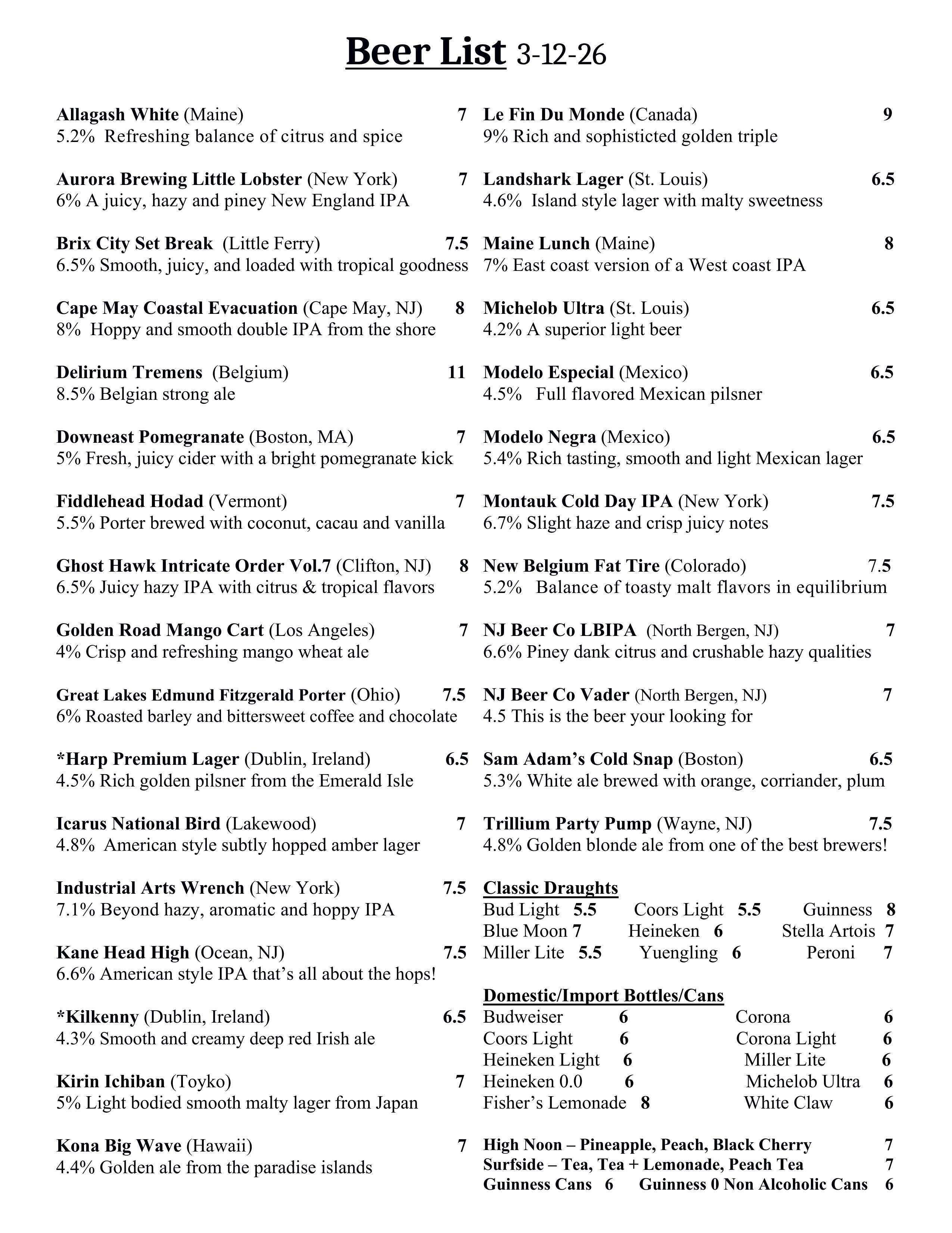 Brew Menu, Wine List & Packaged Goods